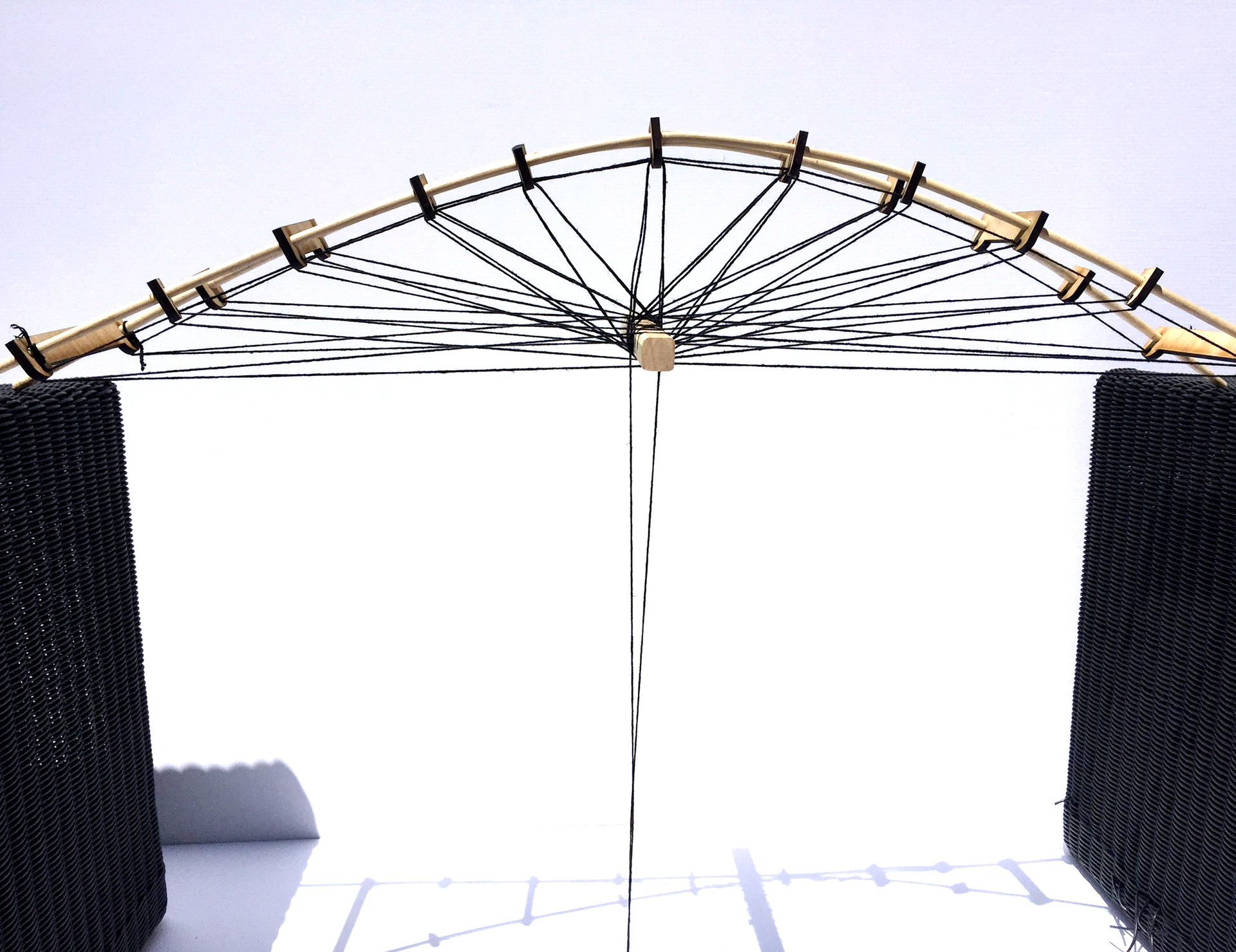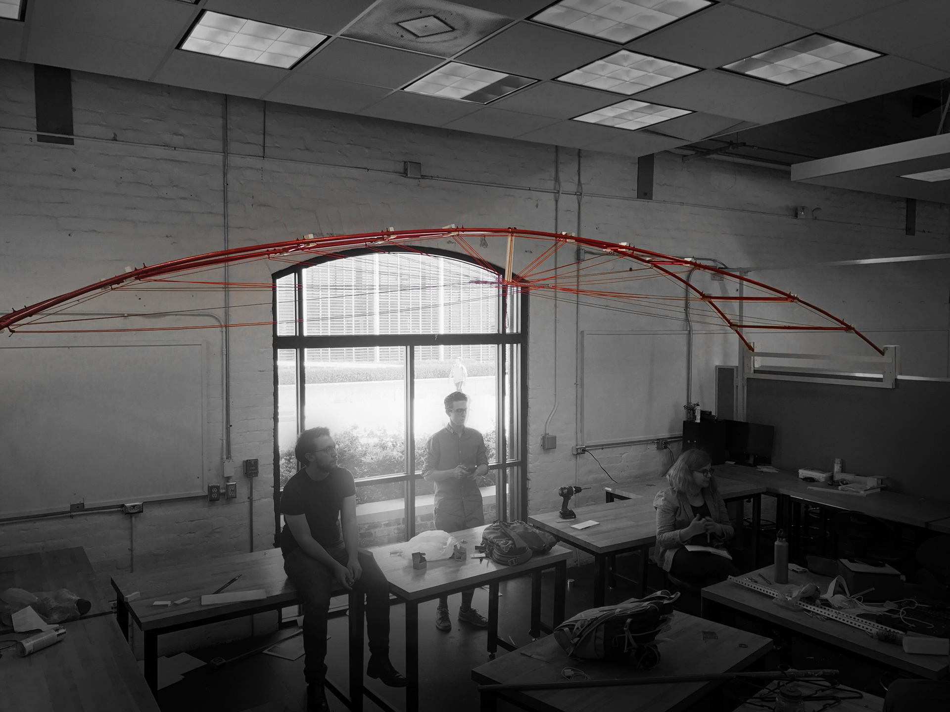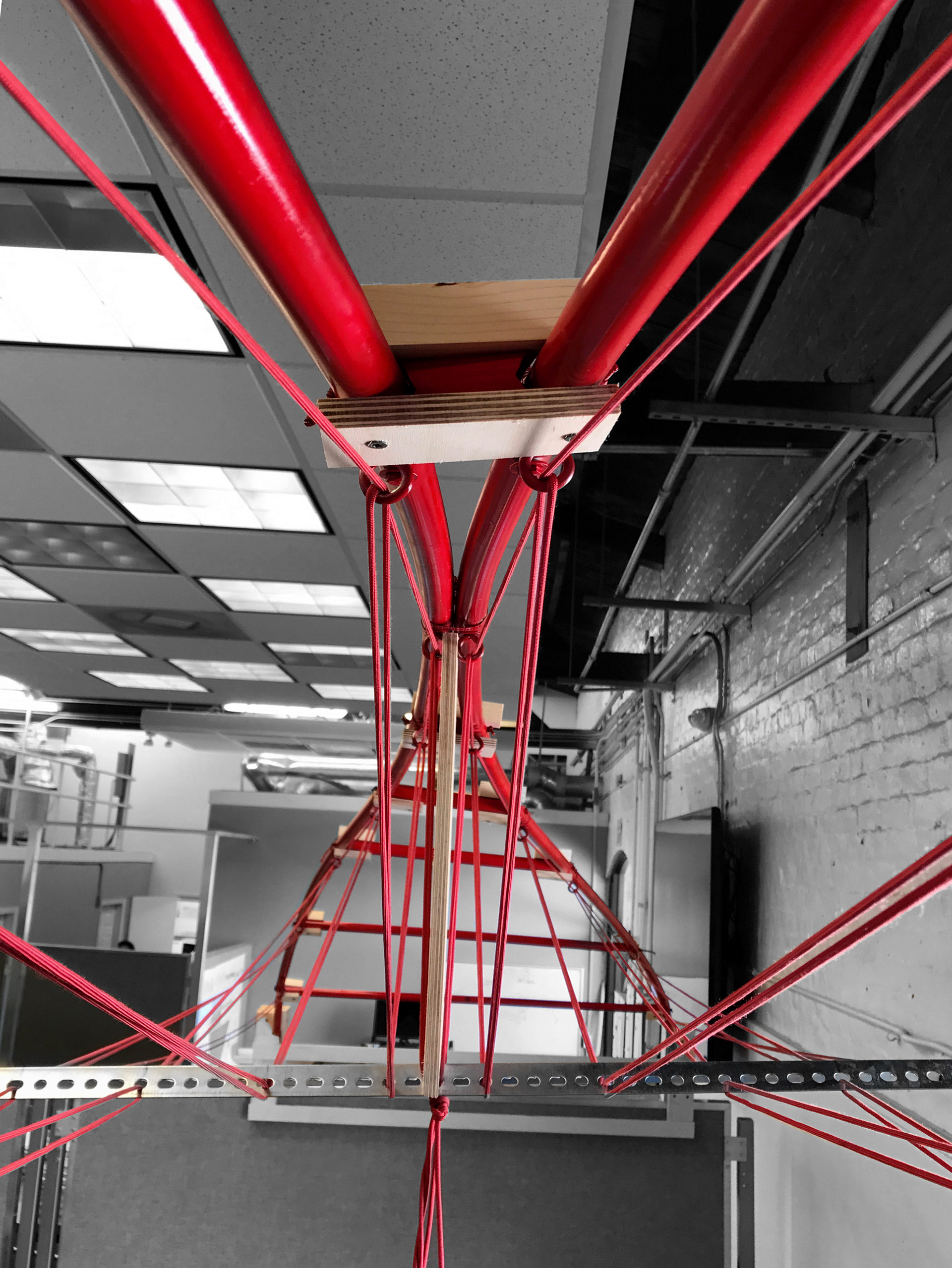 This project consisted of creating long span structures over a 22 ft wide studio. In groups of three, we created these structures and tested them through multiple stages of trial and error. Within the group, I helped with conceptualization, construction and installment. One of the strongest pieces within our design was the idea that as the load became larger, there would be more strength in the structure through the tension formed.